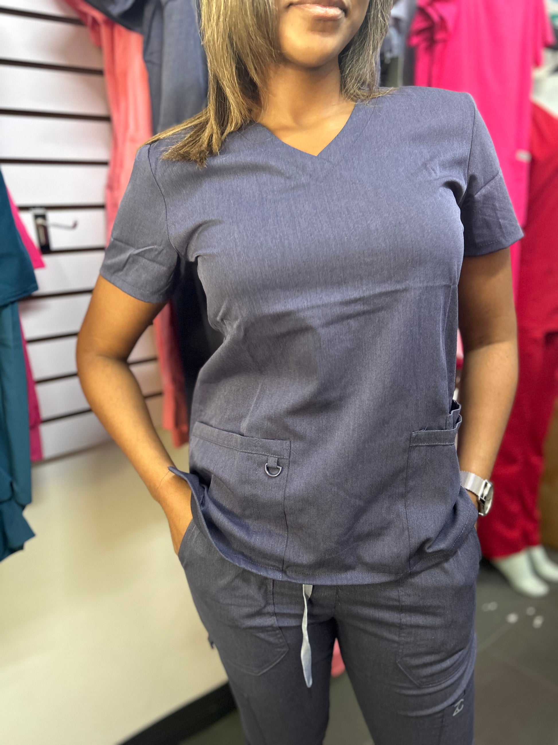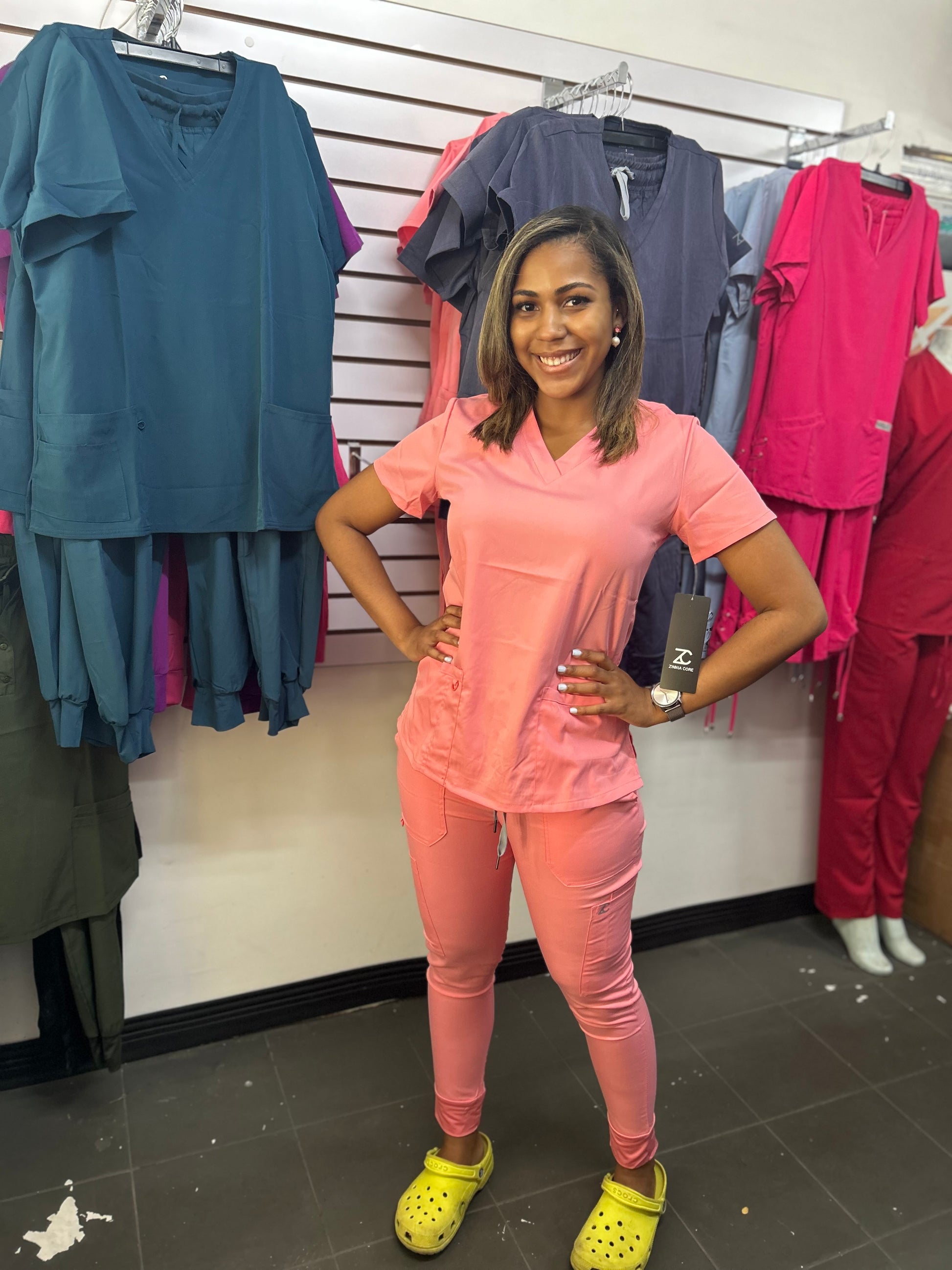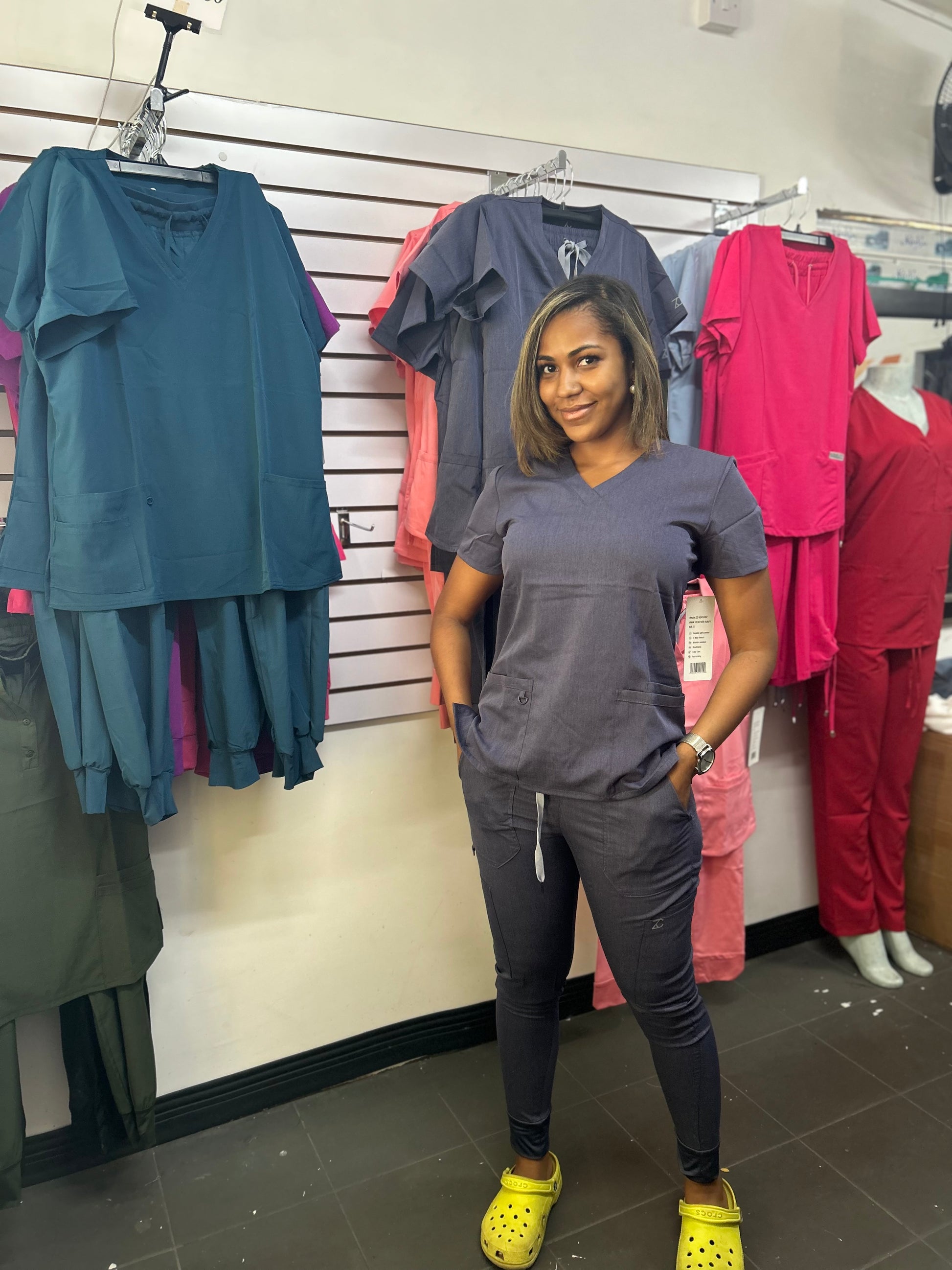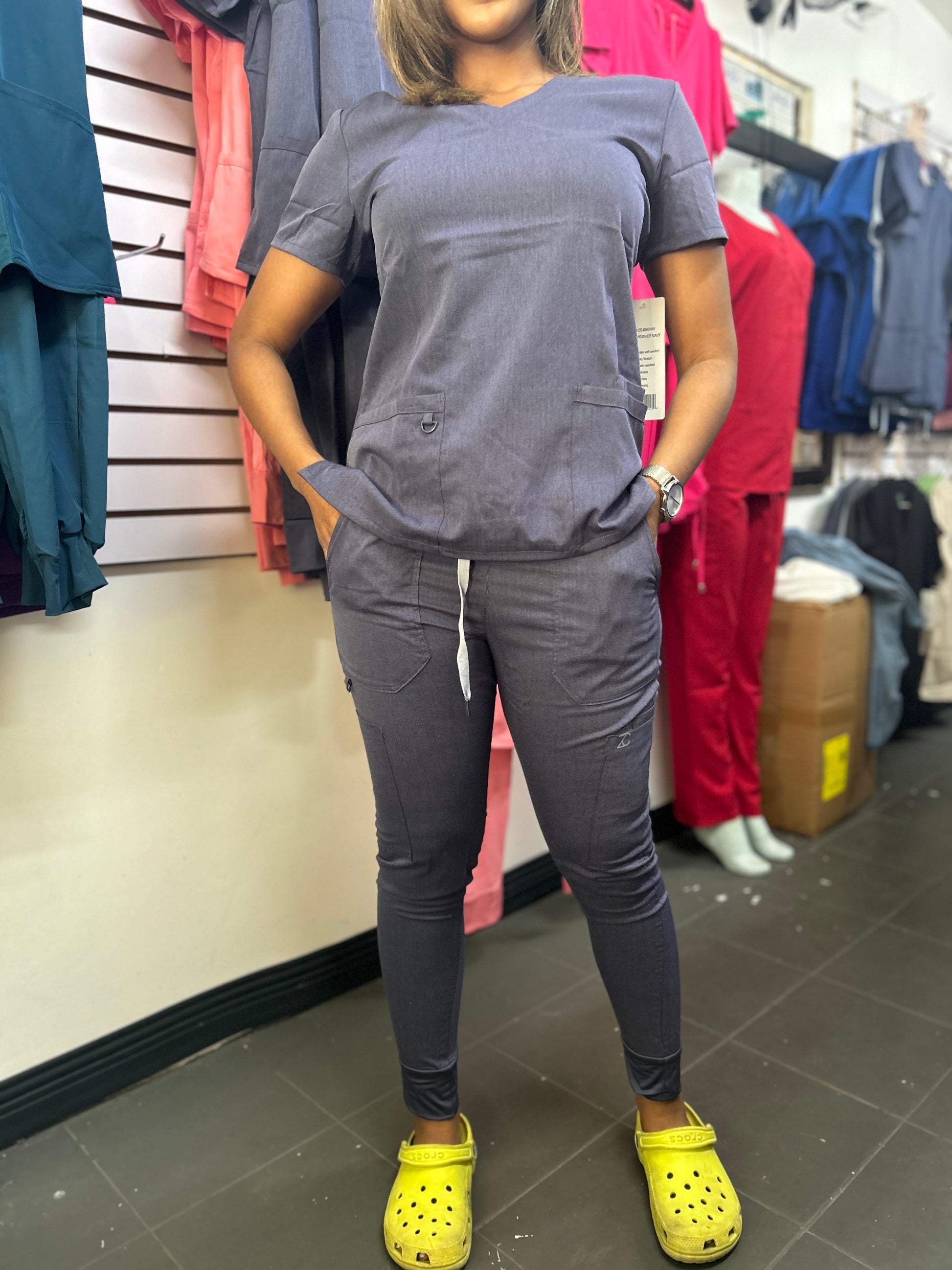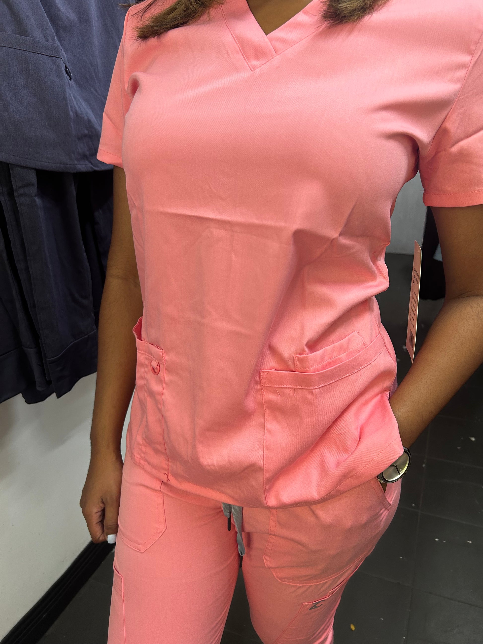 V-neck top with two lower patch pockets pocket with the ring and pen slot. Jogger pants That has an elastic waist with draw cord. Soft Drawer cord opening and aglet finish on cord .